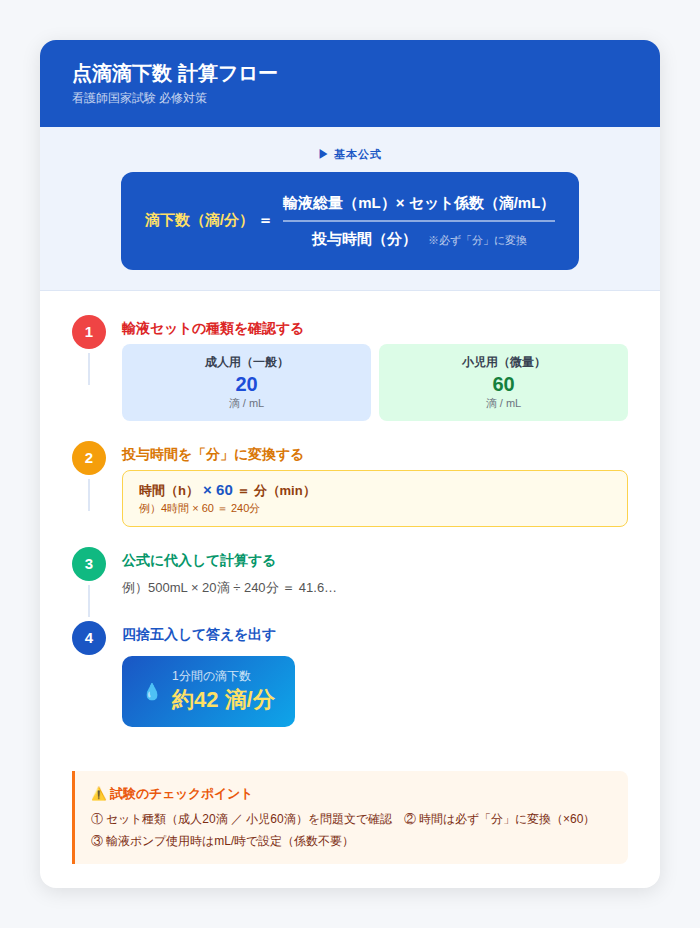 点滴滴下数計算で絶対に忘れてはいけない数値・ルールを以下にまとめます。