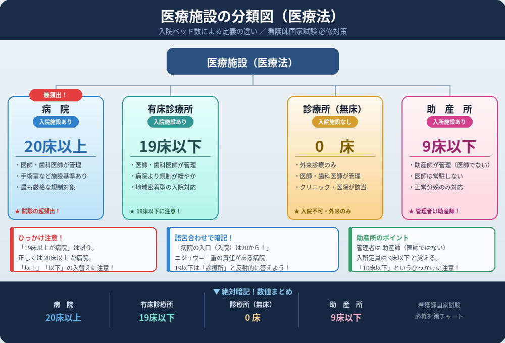 患者が「入院できる施設」は病院と有床診療所です。実習中に「なぜここは入院を受けられないのか(無床診療所)」と感じた場合も、医療法の定義で即座に説明がつきます。