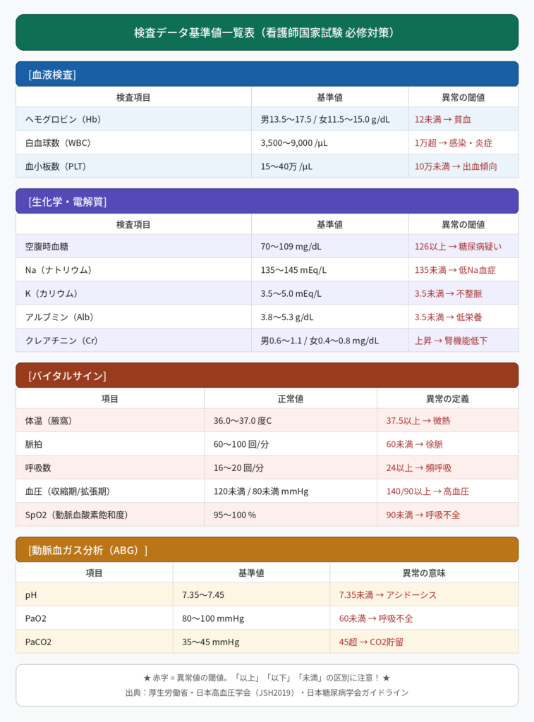 今回の記事で学んだ、絶対に忘れてはいけない必修頻出の基準値を最終確認しましょう。